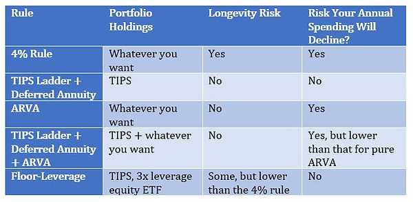 Fortunately, there are several spending rules that have been developed in recent years that better address longevity risk. One is to create a TIPS ladder and combine that with longevity insurance. You can create your own annuity that is indexed to inflation by purchasing a series of treasury inflation protected securities directly from the U.S. government for a certain number of years in the future. You would also purchase longevity insurance today that would kick in when the last of your TIPS ladder expires, which would provide you income for the rest of your life.